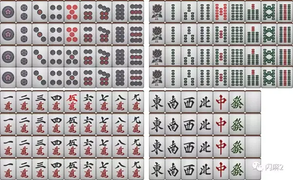 牌山一共136张牌,其中2个红5饼,1个红5索,1个红5万(这4张牌被称为红宝牌,和牌时,手牌中有红宝牌时,得点会增加;);