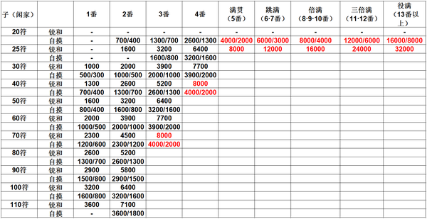 闲家和牌点数 = 4 × 符数 × 2 ^ (番数+2),然后结果向前进位到百位