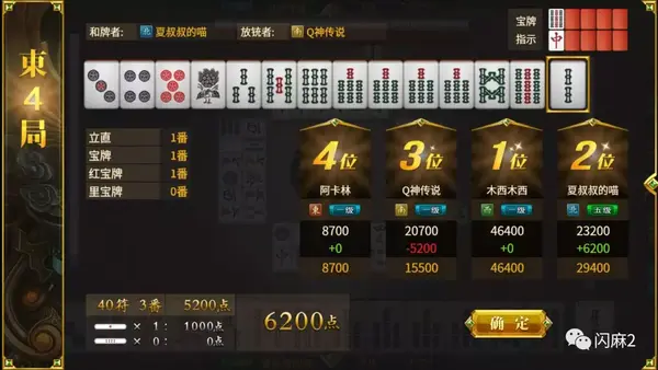 例如上图就是4×40×2^(3+2)=5120≈5200,再加上赢家收回一根立直棒1000点就是6200点啦!