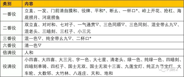 相关役种(番种)参见下表